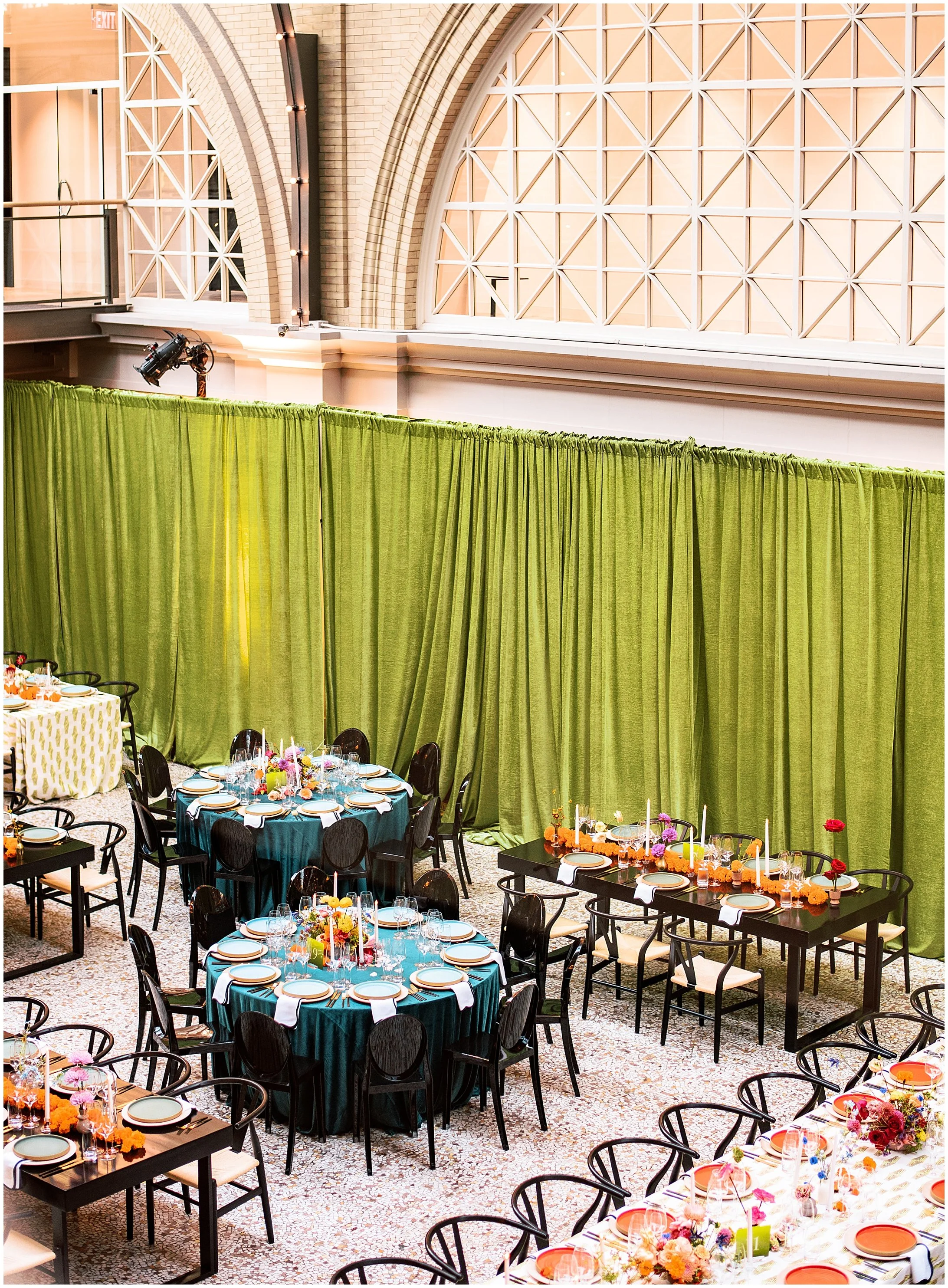 The tablescapes were thoughtfully designed to create variety and dimension throughout the space. Some tables were round, covered in deep aqua-blue velvet linens, and paired with sleek black acrylic chairs, offering a rich and sophisticated feel. Others were long, made of black lacquered wood, with wishbone chairs that added a modern yet organic touch. The final set of tables featured cream and gold printed linens, also paired with wishbone chairs, bringing warmth and texture into the mix. No matter the table style, each was adorned with lush orange marigold garlands, tapered candles, and bud vases filled with vibrant dahlias, mums, and roses in shades of yellow, orange, and pink, creating a layered and dynamic floral design.
